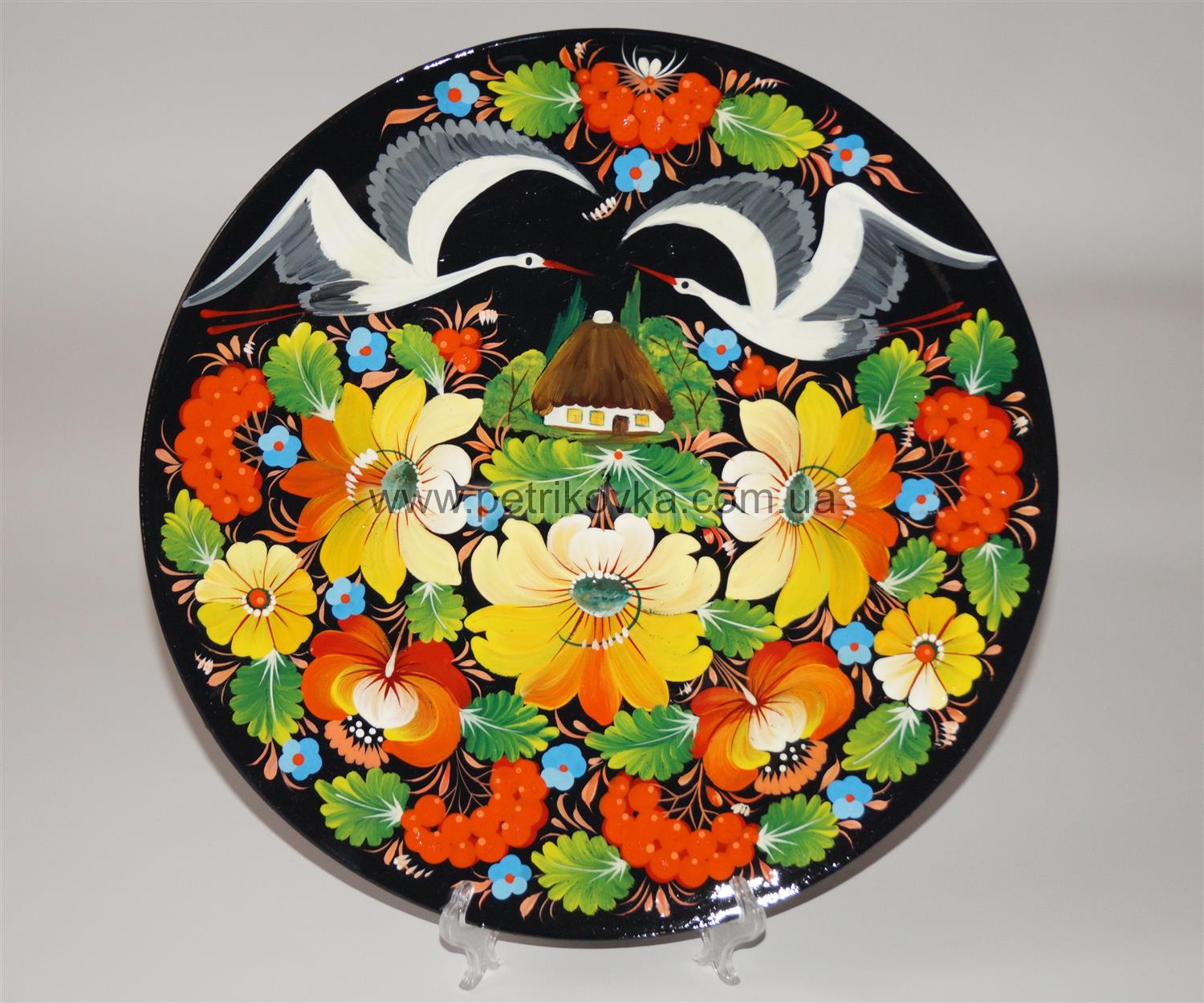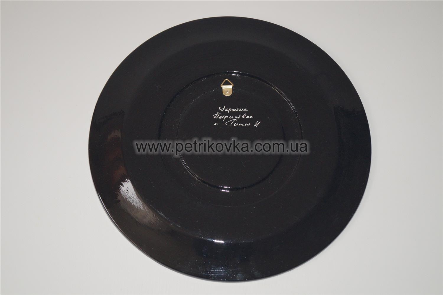 Тарелка ручной работы вырезана из древесины бука и расписана масляными красками. Сверху изделие покрыто лаком. Декоративная настенная тарелка украшена Петриковской росписью. Это традиционная для Украины народная живопись, которой издавна украшают посуду, мебель, стены в домах. Сегодня Петриковка стала национальным достоянием и даже входит в список культурного наследия ЮНЕСКО.