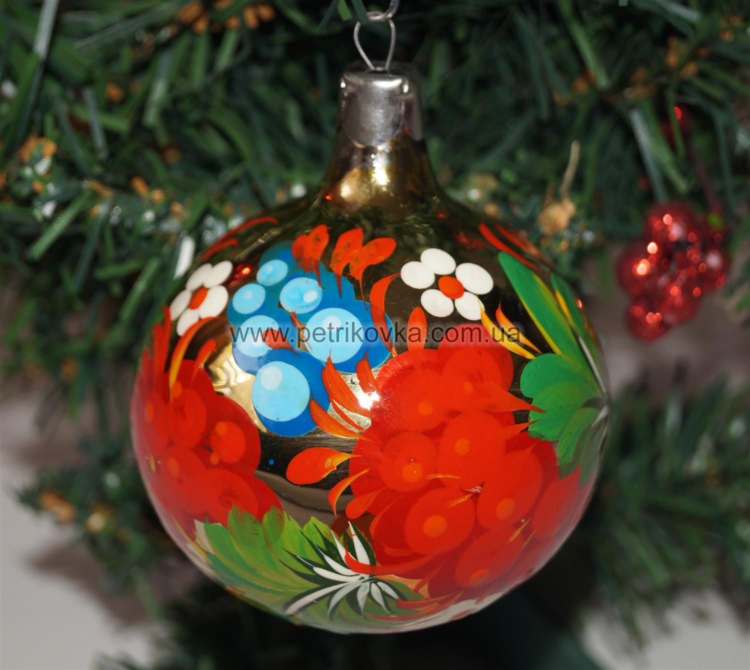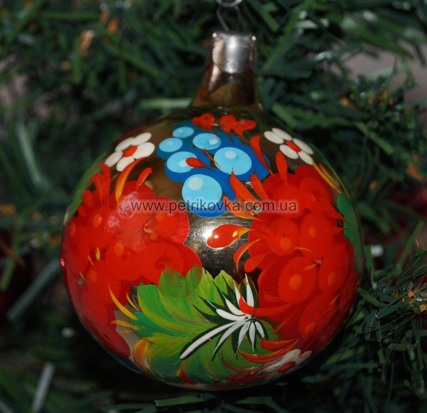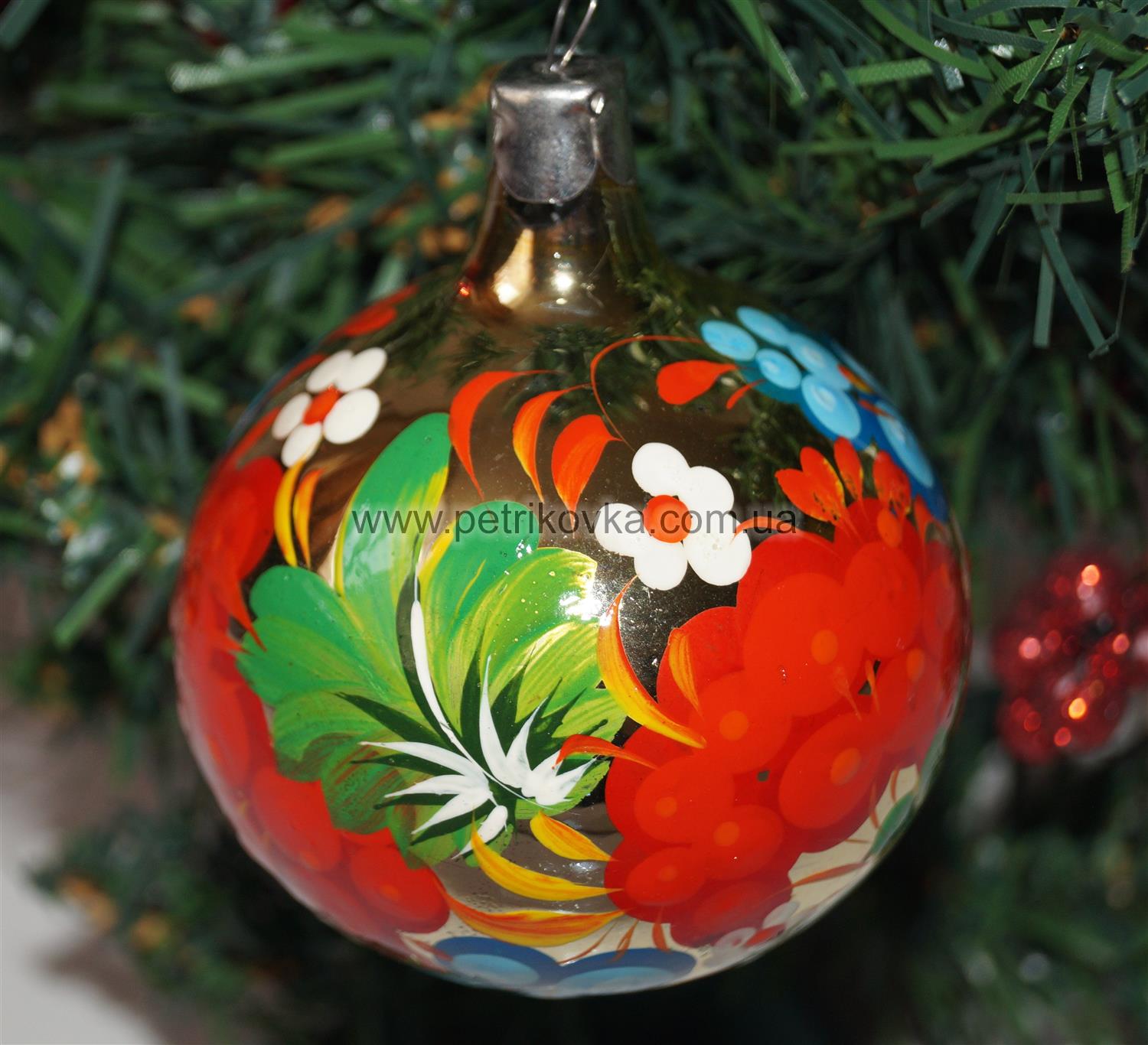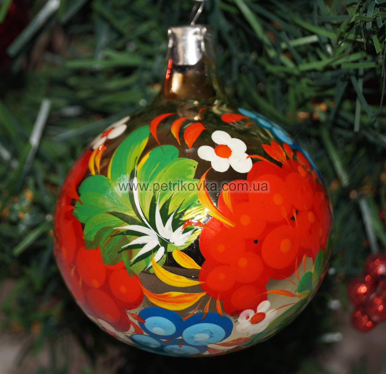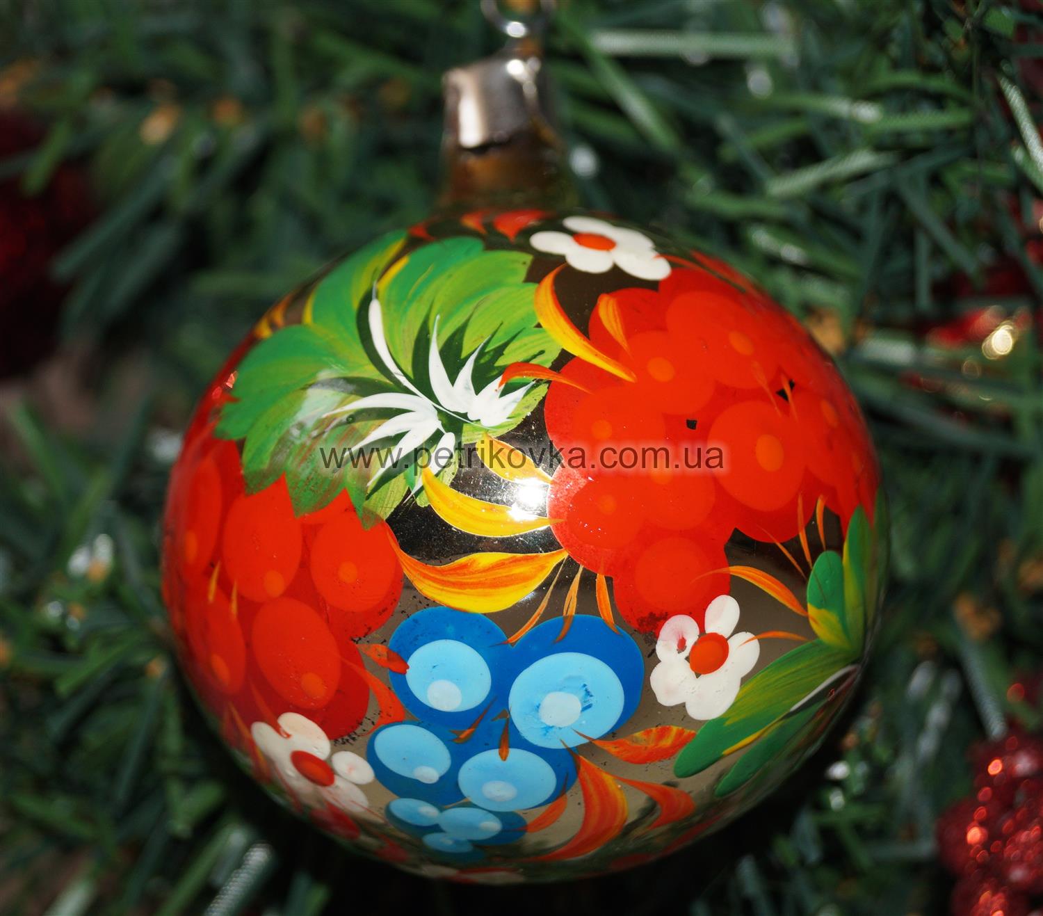 Эта красивая декорирована игрушка в украинском стиле. Расписана вручную с помощью масляных красок в стиле Петриковской росписи. Это традиционный для Украины вид орнаментальной живописи. Игрушка изготовлена из стекла. Это прекрасный подарок на новогодние праздники. Игрушки ручной работы будет радовать своих новых хозяев каждый год.